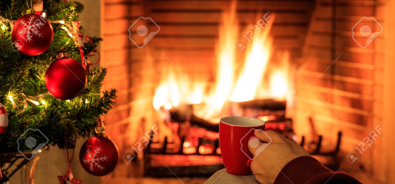 Christmas Tree Burning Fireplace Background Warm Cozy Xmas Holiday Home Christmas Bauble Closeup Greeting Card Template Banner Stock Photo Alamy